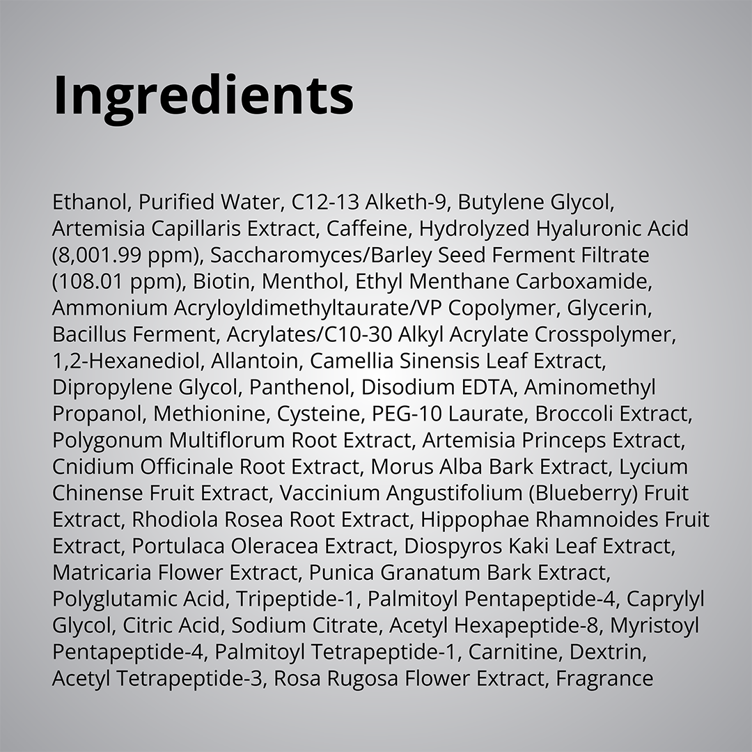 Ethanol, Purified Water, C12-13 Alketh-9, Butylene Glycol, Artemisia Capillaris Extract, Caffeine, Hydrolyzed Hyaluronic Acid (8,001.99 ppm), Saccharomyces/Barley Seed Ferment Filtrate (108.01 ppm), Biotin, Menthol, Ethyl Menthane Carboxamide, Ammonium Acryloyldimethyltaurate/VP Copolymer, Glycerin, Bacillus Ferment, Acrylates/C10-30 Alkyl Acrylate Crosspolymer, 1,2-Hexanediol, Allantoin, Camellia Sinensis Leaf Extract, Dipropylene Glycol, Panthenol, Disodium EDTA, Aminomethyl Propanol, Methionine, Cysteine, PEG-10 Laurate, Broccoli Extract, Polygonum Multiflorum Root Extract, Artemisia Princeps Extract, Cnidium Officinale Root Extract, Morus Alba Bark Extract, Lycium Chinense Fruit Extract, Vaccinium Angustifolium (Blueberry) Fruit Extract, Rhodiola Rosea Root Extract, Hippophae Rhamnoides Fruit Extract, Portulaca Oleracea Extract, Diospyros Kaki Leaf Extract, Matricaria Flower Extract, Punica Granatum Bark Extract, Polyglutamic Acid, Tripeptide-1, Palmitoyl Pentapeptide-4, Caprylyl Glycol, Citric Acid, Sodium Citrate, Acetyl Hexapeptide-8, Myristoyl Pentapeptide-4, Palmitoyl Tetrapeptide-1, Carnitine, Dextrin, Acetyl Tetrapeptide-3, Rosa Rugosa Flower Extract, Fragrance