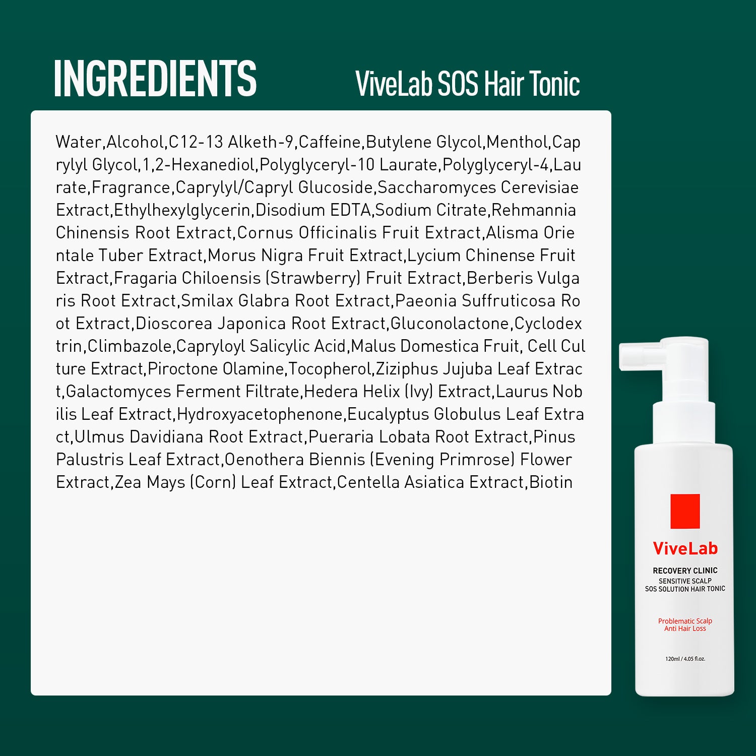 Alcohol, Water, Caffeine, Butylene Glycol, C12-13 Alketh-9, Ammonium Acryloyldimethyltaurate/VP Copolymer, Menthol, Dipropylene Glycol, Acrylates/C10-30 Alkyl Acrylate Crosspolymer, Malus Domestica Fruit Cell Culture Extract, 1,2-Hexanediol, Fragrance, Aminomethyl propanol, Disodium EDTA, Dipotassium Glycyrrhizate, Saccharomyces Cerevisiae Extract, Rehmannia Chinensis Root Extract, Rosmarinus Officinalis (Rosemary) Leaf Oil, Melaleuca Alternifolia (Tea Tree) Leaf Oil, Cornus Officinalis Fruit Extract, Alisma Orientale Tuber Extract, Ziziphus Jujuba Leaf Extract, Laurus Nobilis Leaf Extract, Galactomyces Ferment Filtrate, Eucalyptus Globulus Leaf Extract, Ethylhexylglycerin, Smilax Glabra Root Extract, Paeonia Suffruticosa Root Extract, Dioscorea Japonica Root Extract, Cyclodextrin, Hydroxyacetophenone, Hedera Helix (Ivy) Extract, Mentha Arvensis Leaf Oil, Ulmus Davidiana Root Extract, Pueraria Lobata Root Extract, Pinus Palustris Leaf Extract, Oenothera Biennis (Evening Primrose) Flower Extract, Zea Mays (Corn) Leaf Extract, Centella Asiatica Extract, Biotin